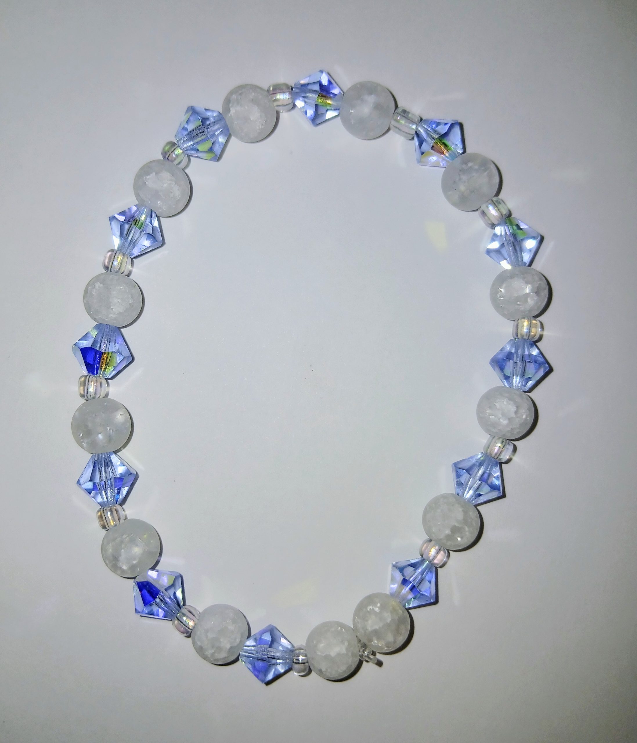 Featuring crackle clear quartz and soft blue Czech glass, this piece supports clarity, emotional balance, and gentle shielding. Clear quartz is associated with cleansing and intention-setting, while blue glass is traditionally linked to tranquility and protective symbolism. Faceted beads catch and reflect light, creating a sense of quiet energetic redirection.
