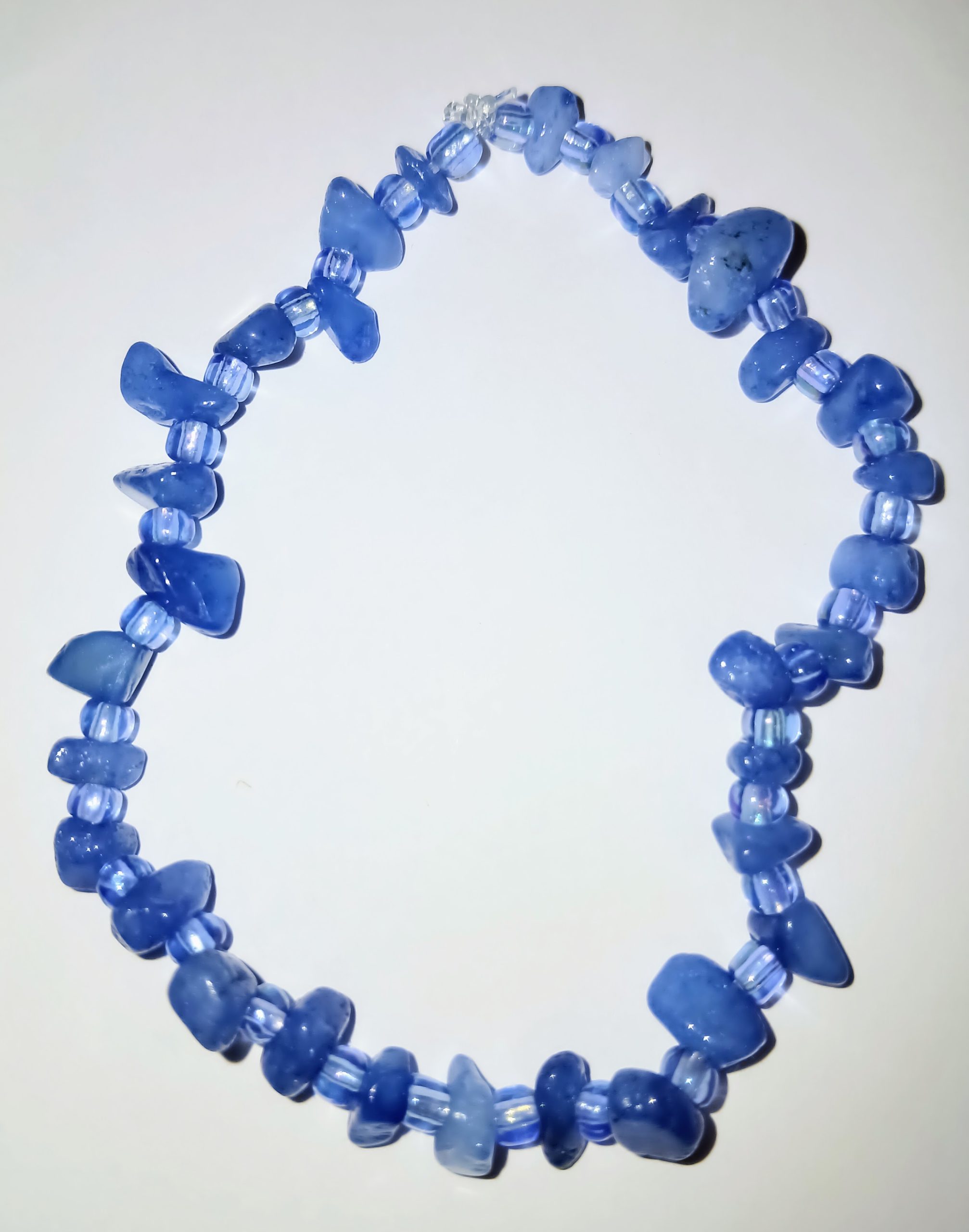 Handcrafted with blue dyed quartz chips and clear glass beads, The Azure Tranquility Guardian is designed to support calm energy, emotional balance, and quiet protection. The soft blue tones are associated with peaceful communication and inner stillness, while clear glass is traditionally linked to clarity and intention amplification.