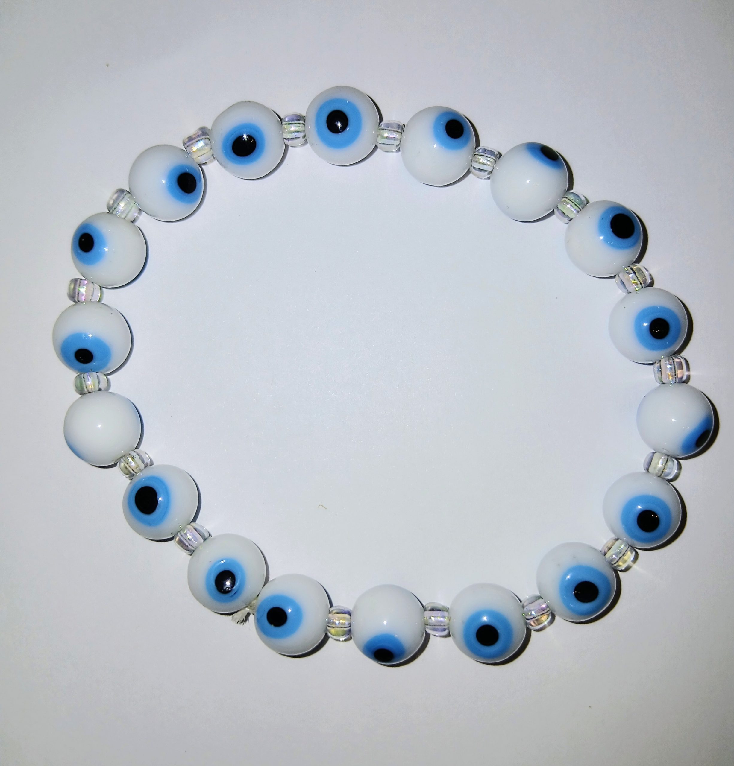 White evil eye beads are traditionally associated with pure protection and energetic balance, while clear glass beads help amplify intention and maintain energetic flow. Together, they create a calm, watchful presence that supports emotional steadiness and spiritual clarity throughout the day.